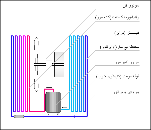 خازن: هدف از بکار گیری خازن عمدتاً افزایش گشتاور در زمان راه اندازی کمپرسور است و معمولاً یک خازن نیز برای راه اندازی موتور فن مورد استفاده قرار می گیرد.