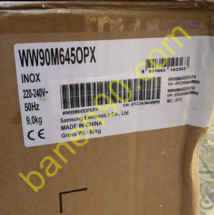پس از اینکه این ماشین را پسند کریدید از فروشنده مدل کامل ماشین لباسشویی را بخواهید. تفاوتی ندارد که به چه صورت این کار را خواهد کرد، کافی است فقط مدل کامل لباسشویی در دسترس شما قرار گیرد. در اینجا باز فرض کنید که برچسب روی کارتن و یا خود ماشین لباسشویی به صورت تصویری است که مشاهده می کنید. اگر به تصویر دقت کنید مدل (کامل) ماشین WW90M645OPX است. این تصویر مربوط به برچسب روی کارتن ماشین لباسشویی است. البته روی خود ماشین هم برچسبی وجود دارد که هم مدل و هم برخی ویژگی های دیگر روی آن قید شده است. در هر حال شما مدل ماشین لباسشویی را خواستید که آن را به دست آوردید.