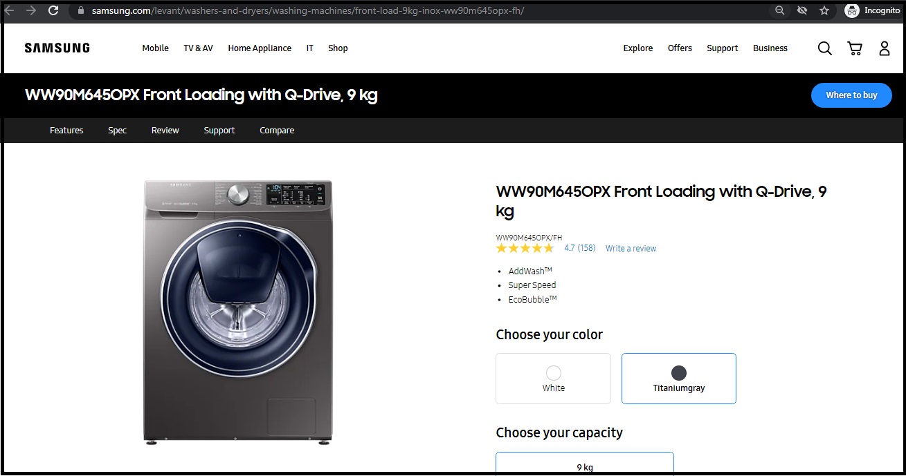 حال باید مدل ماشین لباسشویی را در اینترنت جستجو کنید. کافی است حروف مدل ماشین لباسشویی سامسونگ را در قسمت جستجوی مرورگرتان (تفاوتی ندارد چه مرورگری) بنویسید و آن را جستجو کنید. با این کار مشاهده خواهید کرد که اگر محصول انتخابی شما اصل باشد، اولین لینکهایی که مرورگر به شما پیشنهاد می کند مربوط به وبسایت شرکت سامسونگ است و در آن تصاویری از محصول را به همراه مشخصات کامل آن قرار داده است و با مقایسه این تصاویر و تصویر فوق از شباهت کامل ماشین لباسشویی اطمینان حاصل کنید. همچنین می توانید با مطالعه مشخصات و ویژگی های ماشین لباسشویی در وبسایت شرکت سامسونگ، از صحت سخنان فروشنده در مورد لباسشویی مطمئن شوید. با مقایسه تصاویر این لباسشویی در وبسایت شرکت سامسونگ با تصاویر آن در فروشگاه (بانه 90) و مشاهده شباهت کامل آنها، متوجه می شویم که این ماشین لباسشویی اصل بوده و می توانید با خرید آن از خرید یک محصول اصل لذت ببرید. ما برای سهولت کار شما لینک صفحه مربوط به این محصول را در وبسایت شرکت سامسونگ در زیر قرار داده ایم که با کلیک بر روی آن به صفحه مورد نظر هدایت می شوید.