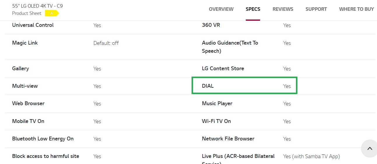 هر تلویزیون یک سری مشخصات دارد که بسیاری از کاربران به ان توجه نمی کنند و سرخود از آنها می گذرند در حالی که این ویژگی و امکانات می توانند در قیمت تلویزیون تاثیر گذار باشند و از طرفی بسیاری از نیاز های کاربران را برآورده می کنند. اما چگونه می توان به مشخصات موجود در تلویزیون ها دست یافت؟ در واقع هر محصول یک وب سایت شرکت سازنده دارد، برای نمونه ما در اینجا وب سایت شرکت ال جی را برای تلویزیون اولد ال جی مدل C9 آورده ایم و در آن ویژگی Dial را مورد بررسی قرار داده و کاربرد های آن را بیان می کنیم: