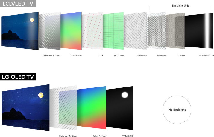 در زیر اجزای تشکیل دهنده صفحه نمایش اولد OLED را اورده ایم، تصویر بالا اجزای صفحه نمایش LED و تصویر پایین اجزای تشکیل دهنده OLED می باشد.