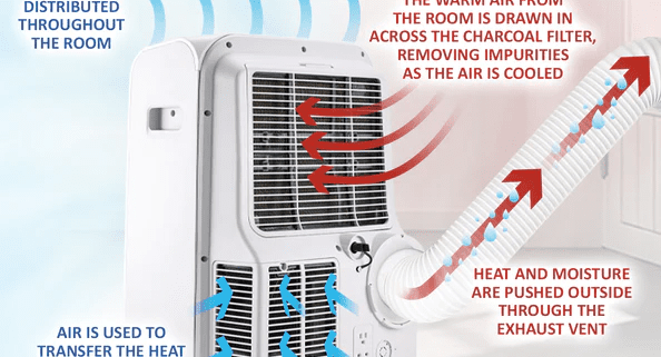 تهویه مطبوع پرتابل یک واحد مستقل است که می توانید آن را در هر جایی از خانه خود قرار بدهید. برخلاف سایر کولرهای گازی، کلیه بخشهای کولرگازی قابل حمل به طور کامل در داخل خانه شما باقی می مانند. کولرگازی قابل حمل با یک شیلنگ و یک کیت پنجره ارائه می شود. این کیت بیشتر پنجره شما را میبندد در حالی که فضایی کوچکی برای وارد کردن شلنگ باقی میگذارد و اجازه میدهد گرما و رطوبت به بیرون تخلیه شود.