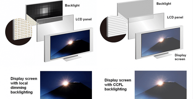 نور پس زمینه بر دو نوع Edge و یا Direct است. بر روی نور پس زمینه Direct دو نوع فناوری Full Array Local Dimming و Local Dimming پیاده می شود که کنتراست و نمایش رنگ سیاه عمیق در فناوری Full Array Local Dimming بیشتر است
