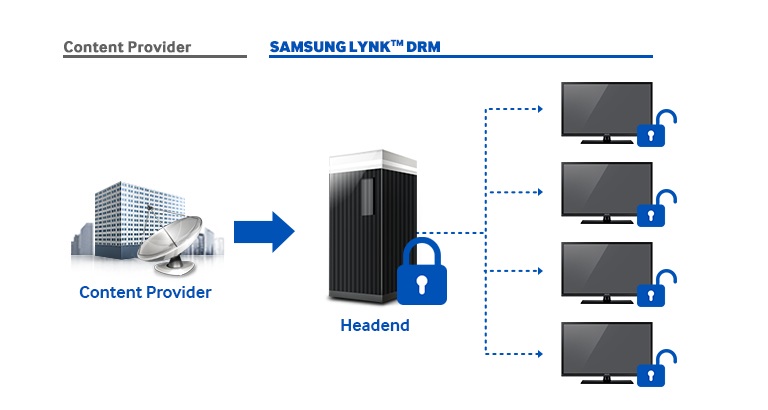 با استفاده از فناوری Samsung LYNK DRM، یک جایگزین امن و اقتصادی برای سیستم های سنتی محافظت از محتوای مبتنی بر یک راه حل سخت افزاری ارائه دهید. این راه حل اجازه می دهد تا کانال های رمزگذاری شده و محتوای ویدئویی درخواستی بصورت ایمن منتقل شده و همچنین در تلویزیون های هتل نمایش داده شوند. فناوری LYNK DRM که صرفاً مبتنی بر نرم افزار است، نیاز به تجهیزات اضافی را کاهش می دهد و در صورت بروز مشکل CAS (سیستم دسترسی مشروط) بازیابی سریعتر را امکان پذیر می سازد.