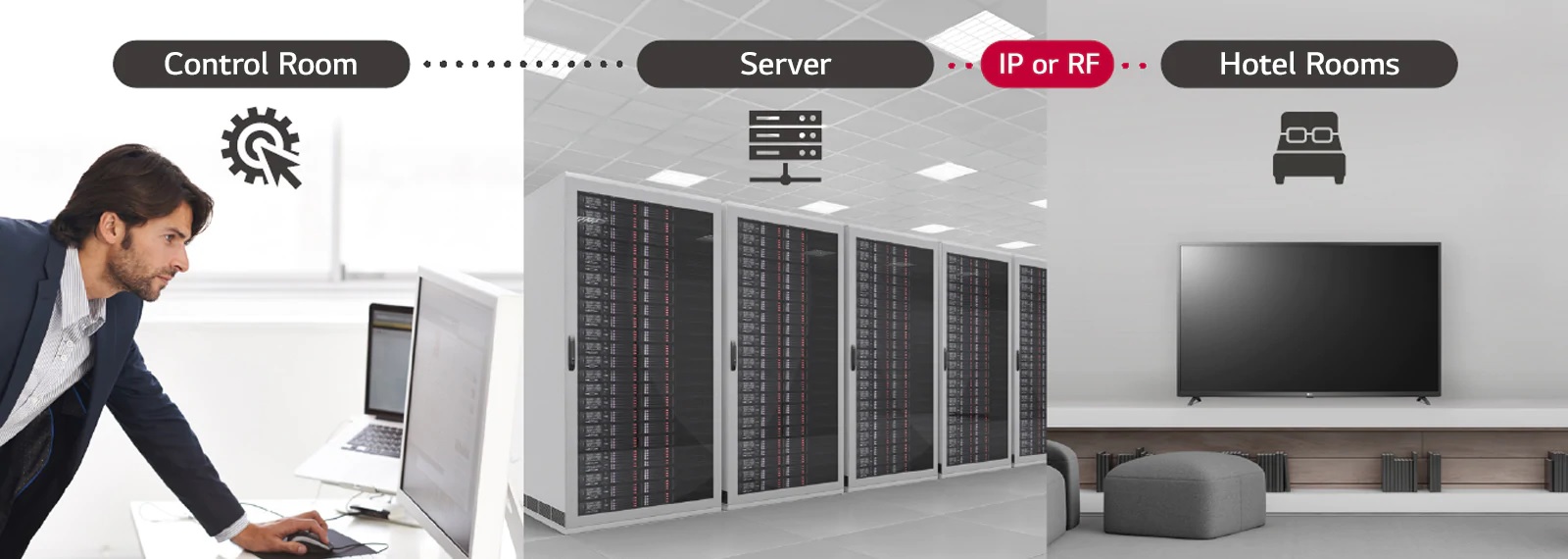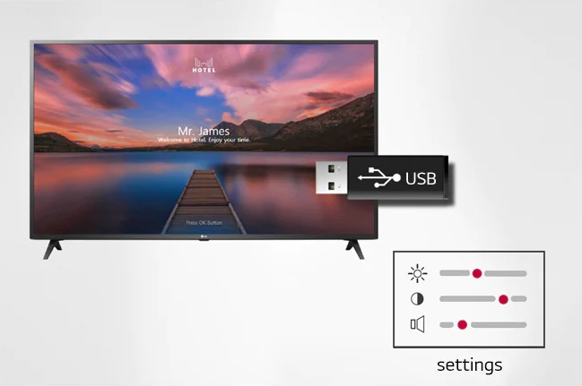 این تلویزیون دارای قابلیت (Hotel Mode (Public Display Mode است و شما می توانید قالب و ظاهر محتوای تلویزیون خود را با توجه به سلیقه خود تنظیم و مدیریت نمایید. شما می توانید حتی این کار را از طریق IP یا شبکه به راحتی انجام دهید. به این ترتیب می توانید شخصیت و برند هتل یا بیمارستان خود را به مشتریان خود نشان دهید و اینکه برای آنها اهمیت قائل هستید. مدیریت تلویزیونهای به کار رفته در اتاقهای هتل و یا بیمارستان می تواند بسیار سودمند باشد. شما حتی قادر خواهید بود تا تلویزیونها را به تنظیمات کارخانه برگردانید.