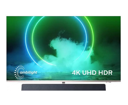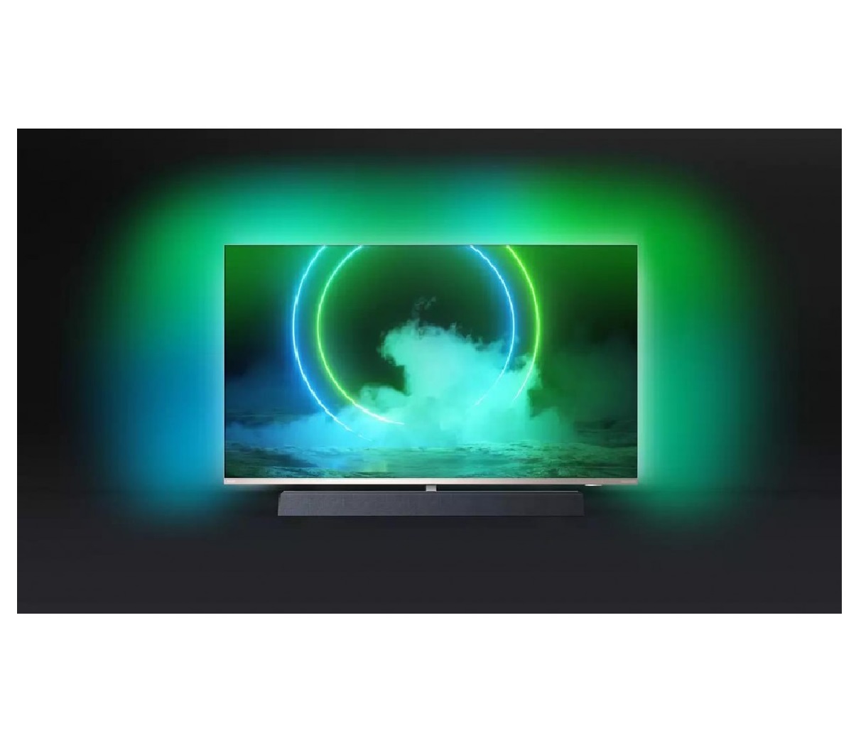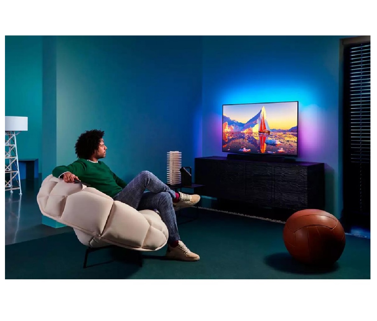 این تلویزیون مجهز به سیستم صوتی 2.1.2 کاناله است و با پخش صدای فراگیر و قدرتمند شما را در فیلم و بازی غوطه ور میسازد. این تلویزیون با برخورداری از چهار بلندگو و یک ووفر قدرتمند صدای شگفت انگیزی را به گوش میرساند. تلویزیون فیلیپس در مجموع از توان صوتی 50 وات برخوردار است و به کمک فناوری Dolby Atmos و Dolby Digital صدای فراگیر و باکیفیتی را پخش میکند. تلویزیون فیلیپس از قابلیت 5-Band Equalizer برای تنظیم دستی صدا استفاده میکند و شما میتوانید به دلخواه خود آن را تنظیم نمایید. همچنین دارای تکنولوژی AI Sound است و صدا را به صورت خودکار با توجه به محتوای در حال پخش تنظیم میکند. این تلویزیون به فناوری Clear Dialogue مجهز شده است و صدای شفاف و واضح را به گوش میرساند. همچنین فناوری Dolby Bass Enhancement برای تقویت و بهبود بیس صدا در این تلویزیون به کار رفته است. تلویزیون فیلیپس به فناوری DTS Play-Fi مجهز شده که به شما اجازه میدهد تا بلندگوهای سازگار را از طریق بیسیم به تلویزیون متصل کرده و از صدای قدرتمند در نقاط مختلف خانه لذت ببرید. مجهز بودن ساندبار تلویزیون فیلیپس به پارچه ای که در کارخانه ی Kvadrat تولید شده است به پخش صدایی آکوستیک کمک میکند. صدای فراگیر و سینمایی که از بلندگوهای این تلویزیون خارج میشود سینما را به خانه شما می آورد.