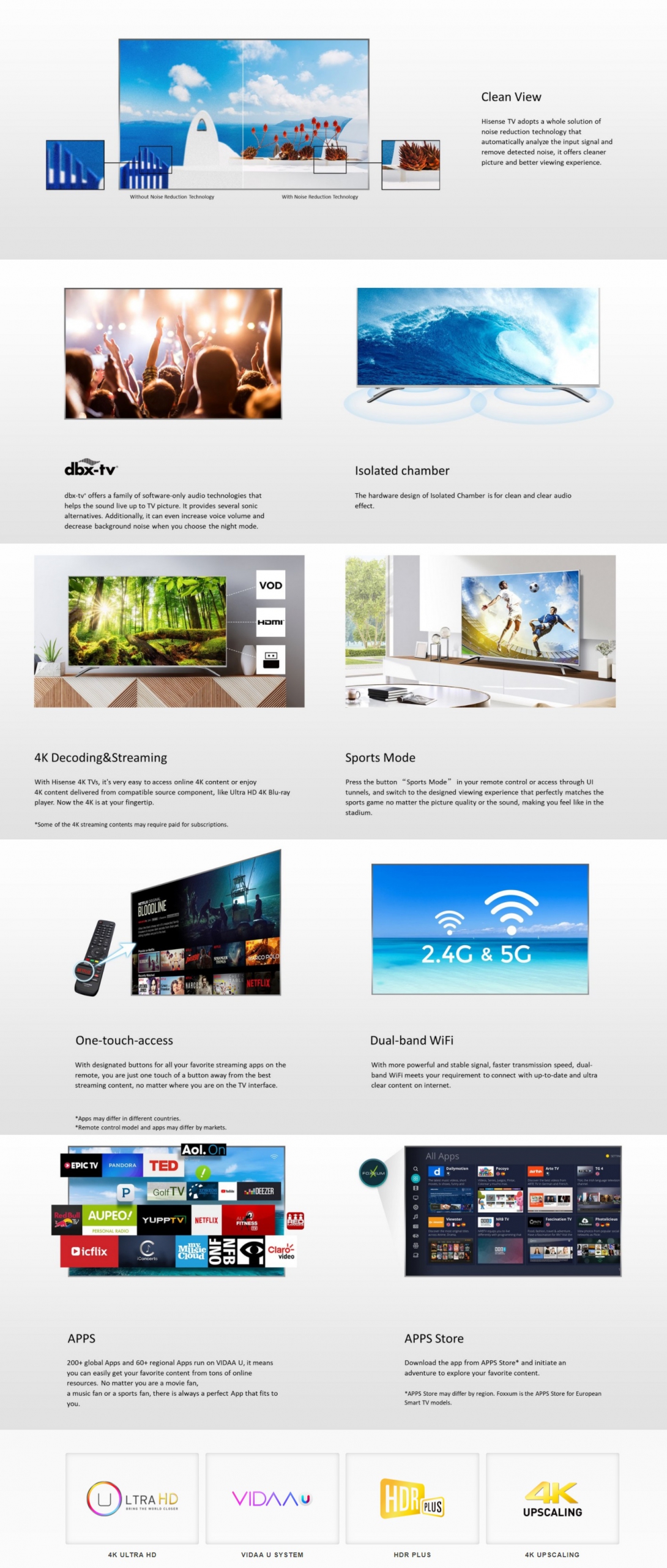 UHD Upscaler یک قابلیت جدید جهت ارتقاء کیفیت تصویر است. با وجود این قابلیت قسمتهایی از تصویر که رزولوشن پایین دارند ارتقاء داده میشوند و تصاویر با کیفیت بهبود یافته دیده خواهند شد. این سطح از کیفیت زیبایی خاصی را به تصاویر میبخشد. از طریق فناوری UHD Upscaler تصاویر ارتقا داده میشود این امر سبب میشود تا محتوای در حال نمایش تلویزیون 65A6500 هایسنس به نحوی تقویت شده و با کیفیت بالا به معرض دید گذاشته شود. البته باید این را نیز بیان کرد که این تلویزیون از حالتهای مختلف تصویر پشتیبانی میکند بدین وسیله کاربران این امکان را خواهند داشت تا تجربه دیداری متفاوتی را داشته باشند.