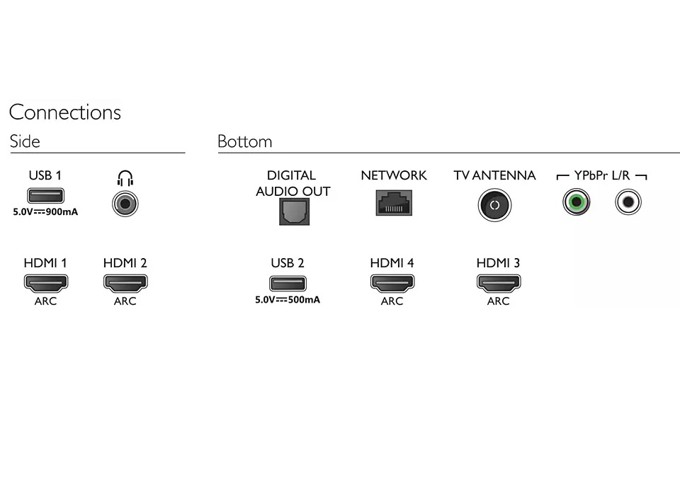 راهکارهای ارتباطی بیسیم تلویزیون فیلیپس 65PUT7374 شامل بلوتوث نسخه 4.2 و Wi-Fi دوبانده میشوند. از راهکار بیسیم و آسان بلوتوث میتوان برای اتصال دستگاههای سازگار به تلویزیون استفاده کرد. از طریق شبکه وای-فای نیز میتوان تلویزیون را به دنیای بدون پایان اینترنت متصل کرد. بجز این میتوان از طریق اتصال کابل به درگاه LAN تلویزیون را به اینترنت متصل کرد. این تلویزیون همچون تلویزیونهای بالارده بازار به 4 درگاه HDMI مجهز شده است. محتوای منتقل شده از درگاه HDMI از وضوح 4K UHD و نرخ تازه سازی 60 هرتز برخوردار خواهد بود ضمن اینکه از تمام فرمتهای HDR برای ارمغان محتوایی طبیعی و زیبا پشتیبانی خواهد شد. با اتصال تیوی باکس، کنسولهای بازی و سایر لوازم پخش کننده به درگاه HDMI از تماشای محتوا در نمایشگر 65 اینچ تلویزیون لذت خواهید برد. فیلیپس 65PUT7374 همچنین به 2 درگاه USB مجهز شده است. با اتصال فلش مموری به این قسمت میتوانید محتوای فیلم و موسیقی را به تلویزیون منتقل کنید. ورودی صدا، خروجی صوتی اپتیکال و خروجی هدفون نیز دیگر درگاههای ارتباطی این تلویزیون محسوب میشوند.