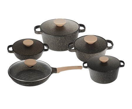 قابلمه 10 پارچه با برند ANC نچسب بودن سرویس را ضمانت کرده است. این سرویس از جنس گرانیت بوده گرانیت مقاومت بسیار بالایی دارد بنابراین نگران چسبیدن یا ته گرفتن غذا نباشید در این محصول از 5لایه آن برای پوشش بدنهی آلومینیومیاش استفاده شده است. همین مورد باعث شده تا به روغن کمتری نیاز داشته، و حرارت را در خود نگاه دارد. غذا به خوبی و بدون نیاز به روغن زیاد مغزپخت خواهد شد. سرویس 10 پارچه گرانیت با 3 قابلمه به ابعاد 28، 24 و 20 یک نیمقابلمه سایز 24 و تابه سایز 28 درب شیشه ای جنسش از آلومینیوم و دارای پوشش گرانیتی است و حرارت را به طور یکسان به تمام ظرف پخش می کند. تابه های این سرویس به صورت تک دسته طراحی شده دستگیرههای این سرویس از جنس الومینیوم است، بنابراین مقاومت بالایی در برابر حرارت دارد.