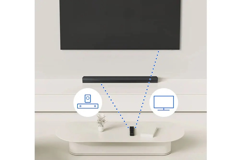 یعنی شما فقط یک ریموت دارید برای تلویزیون و ساندبار — کار شما ساده تر می شود و نیاز به مدیریت چند کنترل جداگانه نیست. توجه داشته باشید که تلویزیون باید از قابلیت هایی مثل HDMI ARC و CEC پشتیبانی کند و ممکن است لازم باشد در ساندبار یا تلویزیون تنظیماتی فعال شود (مثل «TV Remote Control» یا «Auto Power Link») تا ریموت تلویزیون بتواند ساندبار را کنترل کند.