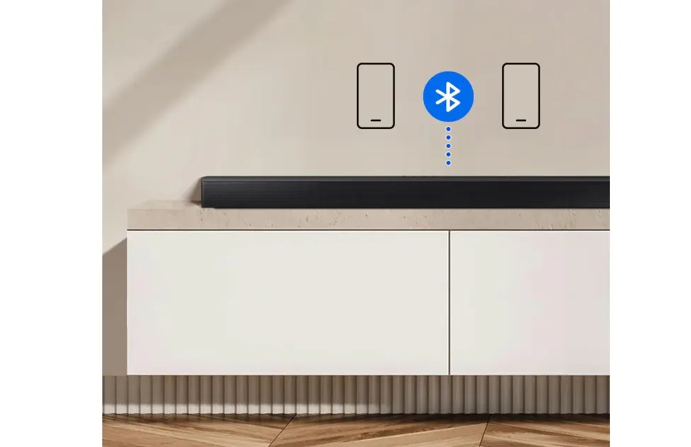 ویژگی Bluetooth® Multi Connection یکی از قابلیت های جالب و کاربردی در ساندبار Samsung HW-B650D است. این قابلیت به شما اجازه می دهد دو دستگاه بلوتوثی (مثل گوشی هوشمند، تبلت یا لپ تاپ) را هم زمان به ساندبار متصل کنید — بدون نیاز به قطع یکی برای وصل کردن دیگری. یعنی، دو گوشی را هم زمان با ساندبار pair می کنی و هرکدام می تواند صدا پخش کند، بدون اینکه بخواهید اتصال گوشی اول را قطع کنید.