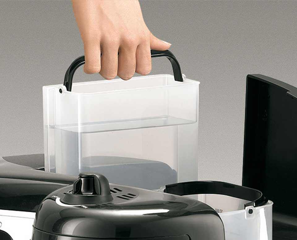 برخورداری از دو مخزن آب مجزا این دستگاه را نسبت به سایر اسپرسوسازها متفاوت کرده است. این دو مخزن پلاستیکی که با برداشتن درپوش بالایی اسپرسوساز با آنها مواجه میشوید، یکی برای حالت تهیهی اسپرسو و دیگری برای قهوهی دمی کاربرد دارند. هر کدام از مخزنها دارای یک دستهی باریک است که برداشتن آنها را راحتتر کرده است. امکان جداسازی مخزن ویژگی کاربردی در دستگاههای اسپرسوساز است که در این مدل لحاظ شده است که تخلیه و نظافت آنها را آسان کرده است. وجود سینی چکهگیر باعث شده آب و قهوهی اضافه سطح دستگاه یا میز را کثیف نکند و بتواند بعدا آن را به راحتی تخلیه کرد. گفتنی است ارتفاع سینی قابل تنظیم نیست و حداکثر ارتفاع لیوان برای این دستگاه به هشت سانتیمتر میرسد.