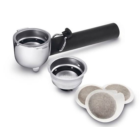 قسمت چپ دستگاه مخصوص تهیهی اسپرسو است. با استفاده از این دستگاه میتوان یک یا دو فنجان اسپرسو از پودر اسپرسو یا پد آن تهیه کرد. خروجی اسپرسو نیز دو نازل نزدیک به هم دارد که میتوان زیر آن دو فنجان یا یک فنجان در وسط قرار داد تا هر دو نازل درون آن قرار بگیرد. برای تهیهی یک فنجان اسپرسو کافی است یک پیمانه پورد اسپرسو یا یک پد داخل تمپر قرار دهید و صافی فلزی را روی آن بگذارید و قفل را ببندید تا اسپرسو تحت فشار قرار گیرد. مخزن آب اسپرسو در قسمت چپ دستگاه قرار دارد و میتوان آن را خارج کرد. این مخزن، فیلتر مخصوصی دارد؛ ولی بهتر است در آن از آب تصفیهشده استفاده شود. اگر در مخزن اسپرسو پودر یا پد قرار نگیرد، خروجی آن آب داغ خواهد بود.