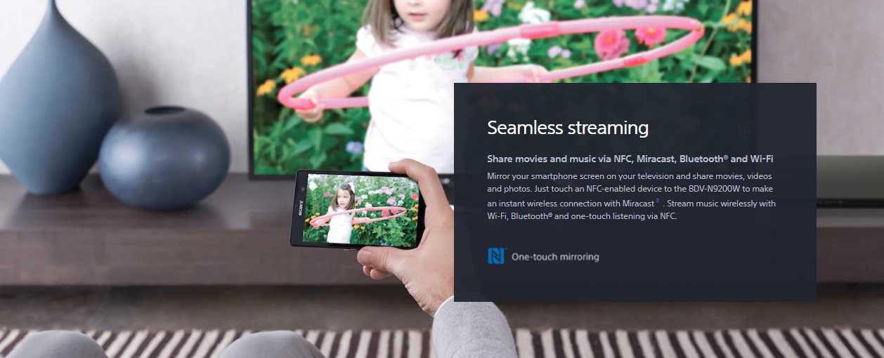 صفحه گوشی هوشمند خود را بر روی تلویزیون پخش کرده و فیلم ها و عکس ها را به اشتراک بگذارید. فقط کافی است یک دستگاه مجهز به NFC را به ساندبار سونی وصل کنید تا یک اتصال بی سیم فوری با∗Miracast برقرار کند. موسیقی را به صورت بی سیم با Wi-Fi® ،Bluetooth و one-touch listening از طریق NFC پخش کنید.