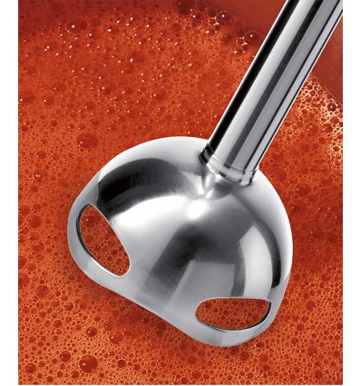علاوه بر میله اصلی گوشتکوب، یک لیوان شفاف مدرج، یک میله همزن و یک ظرف خردکن به همراه این مدل عرضه میشود. در صورت نیاز به استفاده از یخ خردشده، میتوانید از تیغهای که مختص این کار در نظر گرفته شده است استفاده کنید. ضمنا این مدل سرعت توربو هم دارد که با نگهداشتن دکمهی مربوطه روی بدنهی اصلی دستگاه، باسرعت فعالیت میکند و بهمحض رهاکردن میایستد.