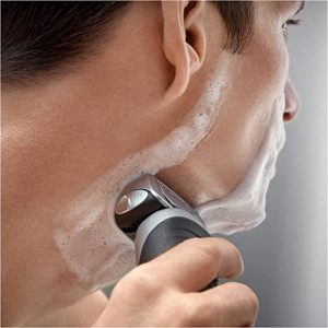 پشت ماشین اصلاح براون مدل 7899CC نرم و ارگونومیک طراحی شده است و به خوبی در دست جای میگیرد. هر دو طرف ماشین اصلاح دو قسمت لاستیکی مشکی تعبیه شده که باعث میشوند دستگاه در دست محکم بایستد. حتی وقتی زیر دوش، با کف یا ژل اصلاح کنید. قسمت فویلی بالای سری قرار دارد به این صورت انعطاف آن بیشتر شده و فارغ از بدنه دستگاه حرکت میکند. در قسمت پایین ماشین اصلاح یک دکمه با یک دایره آبی قرار دارد. دو طرف این دکمه دو دکمه + و – ( مثبت و منفی ) قرار دارد که سرعت موتور را کم وزیاد میکنند.