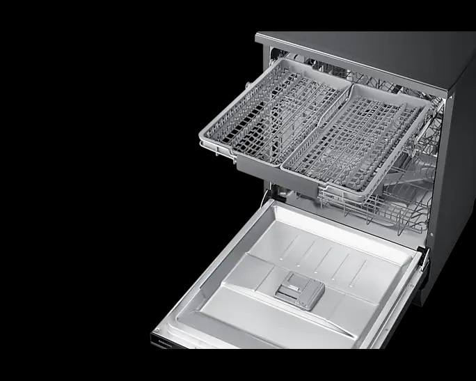 مهمترین قسمت هر ظرفشویی که در برخورد با ظروف قرار دارد، ساختار داخلی است. جنس فضا داخل و بغل DW60A8050FG از استیل ضد زنگ است که در برابر آب و زنگ زدگی بسیار مقاوم است. قسمت داخل دارای سه طبقه است. نکته جالب در این قسمت استفاده از گیره و اهرم هایی جهت آزاد کردن کشوها و طبقات هستند. یکی از سبدها Soft Railing نام دارد که همانطور از اسم آن پیدا است یک سبد نرم و سبک که برای استقرار ظرفشویی عالی و برای تخلیه بسیار آسان است.