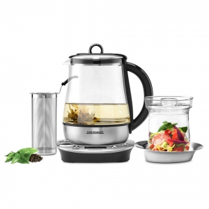 کتری چای ساز 42438 از جنس پیرکس می باشد و سبد آسانسوری چای ساز نیز از جنس استیل زنگ است، همچنین دستگاه گاستروبک 42438 مجهز به صفحه نمایشگر LCD با نور پس زمینه می باشد.
