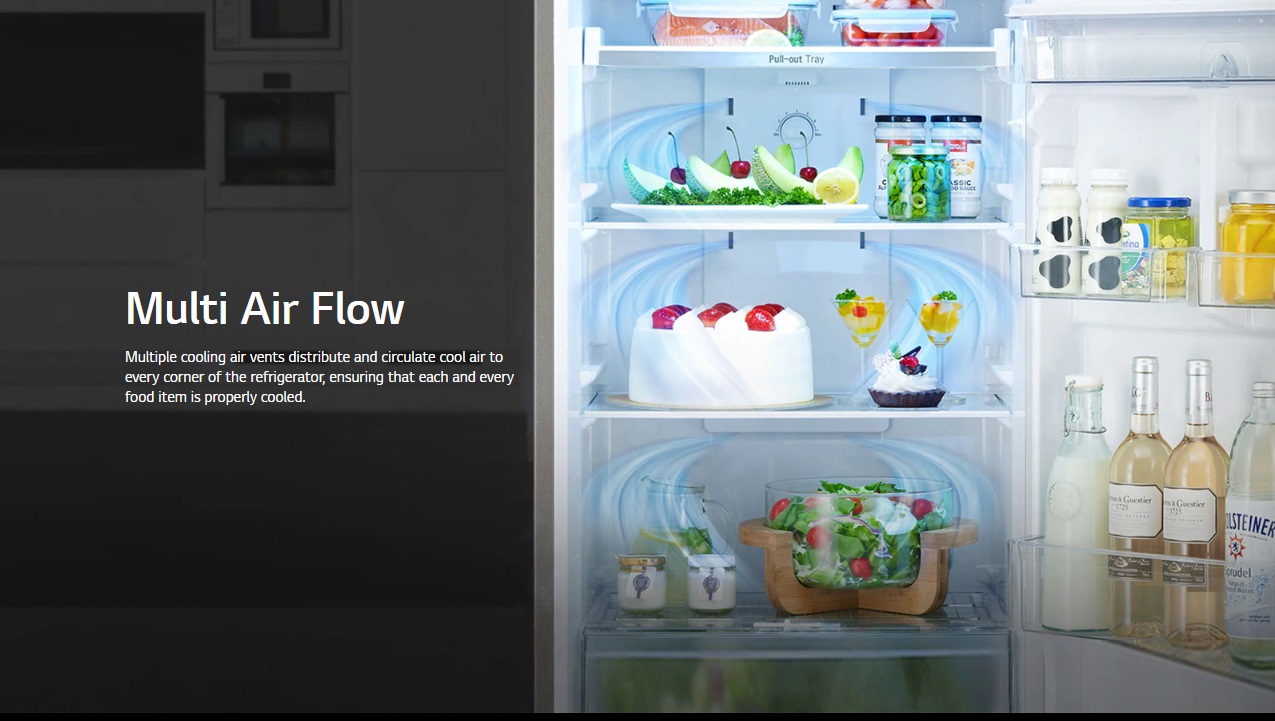 این یخچال از سیستم خنک کنندگی Multi-Air Flow بهره میبرد. این سیستم خنک کننده برای یک نوع یخچال همچون فریزر ال جی که از بخش ها و قسمت های مختلفی برخوردار است بهترین گزینه می باشد چرا که با نفود به تمامی بخش های آن خنک کنندگی را به صورت مداوم در هر بخش به جریان در می آورد. همراه با تکنولوژی Multi-Air Flow این اطمینان به شما داده میشود که طروات و تازگی مواد غذایی دو برابر بیشتر خواهد شد. به عبارتی دما و رطوبت در هر کدام یک از قسمت های یخچال و فریزر در حد ایده آلی قرار داده می شود که با اطمینان خاطر می توانید هر نوع ماده غذایی را تا مدت زمان طولانی در داخل آن ذخیره سازی کنید. سیستم چند جریانی هوا یا همان Multi Air Flow با انتشار هوا از هر جهتی، خنک سازی تمامی بخشهای داخلی را انجام میدهد. همراه با موتور اینورتر خطی، یخچال فریزر ال جی از دوام و طول عمر بسیار بالایی برخوردار شده و با خنک کنندگی مناسب، کیفیت مواد غذایی تضمین خواهد شد. در کل میتوان گفت اگر این نوع یخچال را از هر نظر بسنجیم به بی عیب و نقص بودن آن پی خواهیم برد.