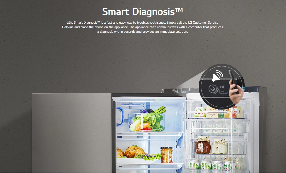 سیستم عیب یابی هوشمند ( Smart Diagnosis ) راهی جالب برای رفع مشکلات دستگاه در بیشتر محصولات ال جی میباشد و به این کمپانی تعلق دارد. برای رفع مشکل دستگاه کافی است که اپلیکیشن عیب یابی هوشمند را روی گوشی موبایل هوشمندتان نصب کنید، سپس با خدمات مشتریان الجی تماس بگیرید و گوشی موبایلتان را جلو دستگاه قرار دهید. در این صورت سیگنالهایی از طریق گوشی موبایل توسط یخچال به رایانه عیب یاب فرستاده میشود تا در ظرف چند ثانیه راه کارهایی برای رفع مشکل ارائه شود.