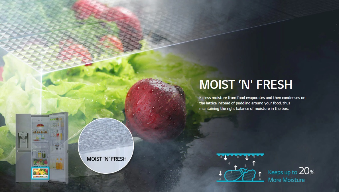 با کشوی نگهدارنده رطوبت، رطوبت اضافی به جای اینکه مواد غذایی را خیس و فاسد کند، از روی مواد غذایی تبخیر شده و روی جداره مشبک مینشیند؛ بنابراین رطوبت متعادل و مناسب در محفظه حفظ خواهد شد. با وجود این دیوار مشبک رطوبت اضافی خوراکی ها که باعث فاسد شدن آنها خواهد شد، گرفته شده و در صورت نیاز و زمانی که رطوبت کشو پایین آمد از آن استفاده می شود. توانایی هایی که شرکت ال جی در یخچال خود به کار برده است، هر کاربری را به آسایش و سلامتی می رساند. ال جی با تعبیه این کشو در این یخچال نشان داد که می توان مواد غذایی و خوراکی را برای مدت زمان طولانی تر نگهداری کرد.