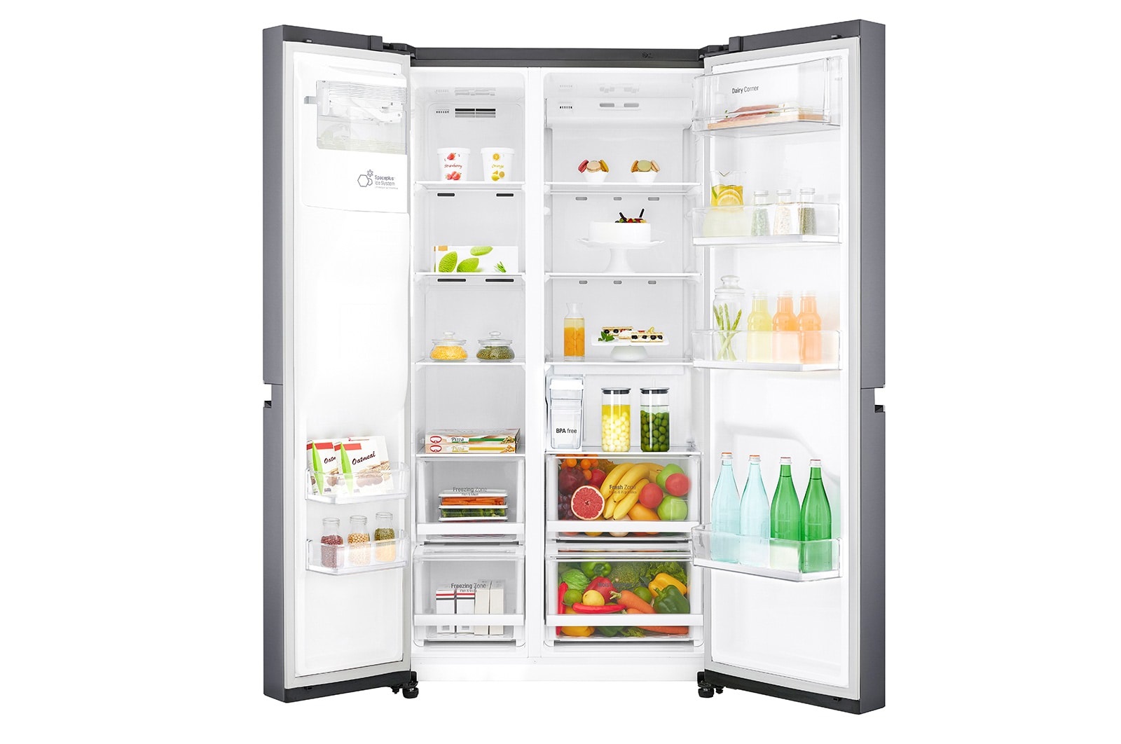 از دیگر امکاناتی که این ساید بای ساید ال جی در اختیار می گذارد، هر کدام از قابلیت های آب سردکن و یخ ساز هستند، که طراحی اهرم آنها بر روی درب یخچال نهاده شده اند. سیستم یخ ساز SpacePlus به صورت کاملا باریک و حرفه ای بر روی درب فریزر طراحی شده، به طوری که فضای ذخیره سازی فریزر را کاملاً مدیریت می کند. به زبان ساده تر این سیستم اجازه می دهد تا از حداکثر ظرفیت فضای داخلی فریزر برخوردار شوید و غذای بیشتری را نگه داری کنید و همچنین راحت تر به یخ دسترسی داشته باشید. همچنین سیستم آبریز و یخ ریز به کونه ای طراحی شده است که حتی ظروف بلند هم می توانند در آن جای بگیرند بدون آنکه از ظرفیت بالای این یخچال کاسته شود.