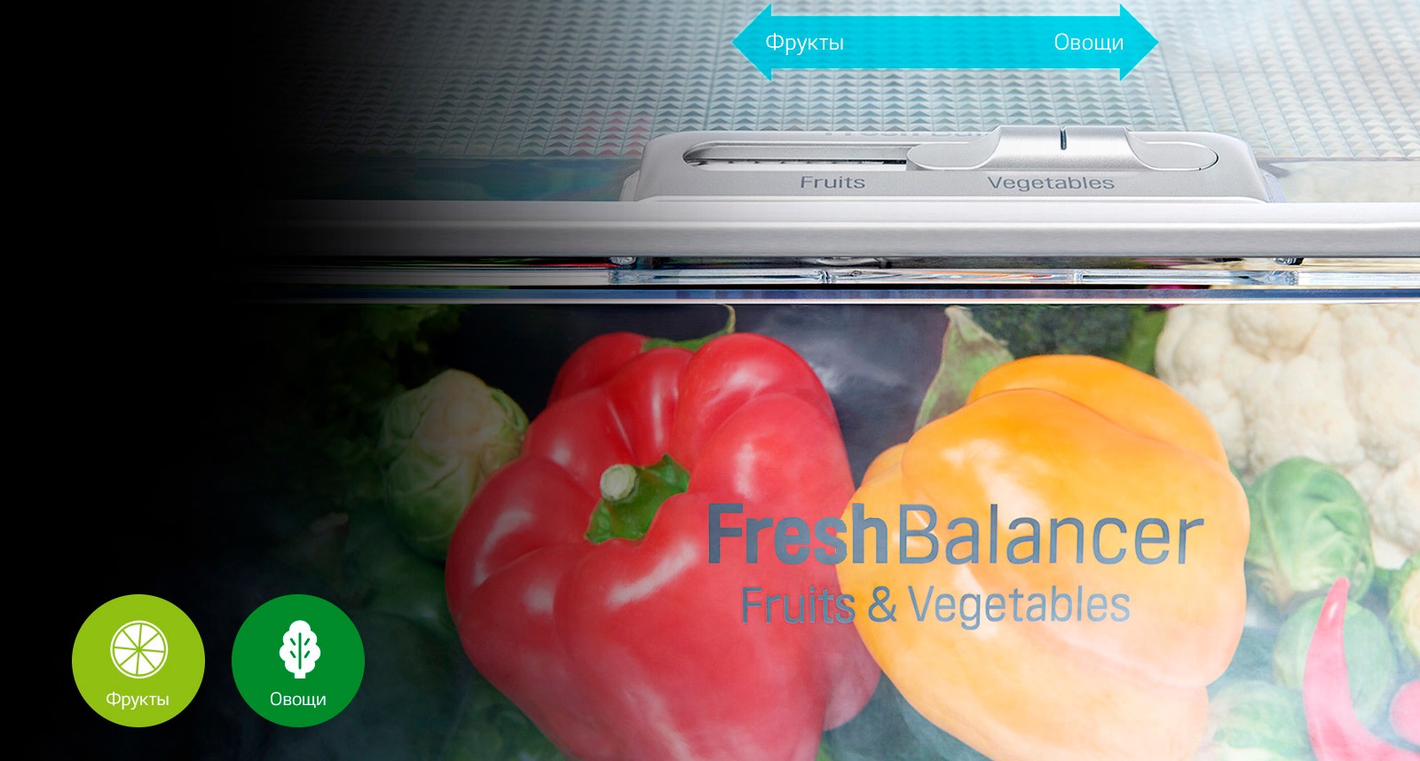 در قسمت پایین یخچال فریزر ال جی کشویی به نام Fresh Balancer جود دارد، که می توانید میوه و سبزیجات خود را داخل این کشو قرار دهید. این کشو با قابلیت تنظیم رطوبت، رطوبت مناسب را برای میوه ها و سبزیجات به وجود می آورد. بنابراین با بهینه سازی میزان رطوبت موجود در Fresh Balancer طول عمر میوه و سبزیجات خود را طولانی کنید. همچنین بر روی این کشو دو دکمه به نام های Fruit و Vegetable وجود دارد. با کشیدن دکمه به سمت کلمه Fruit شرایط مناسب برای نگهداری میوه و با کشیدن دکمه به سمت کلمه Vegetable شرایط مناسب برای نگهداری سبزیجات را ایجاد کنید.