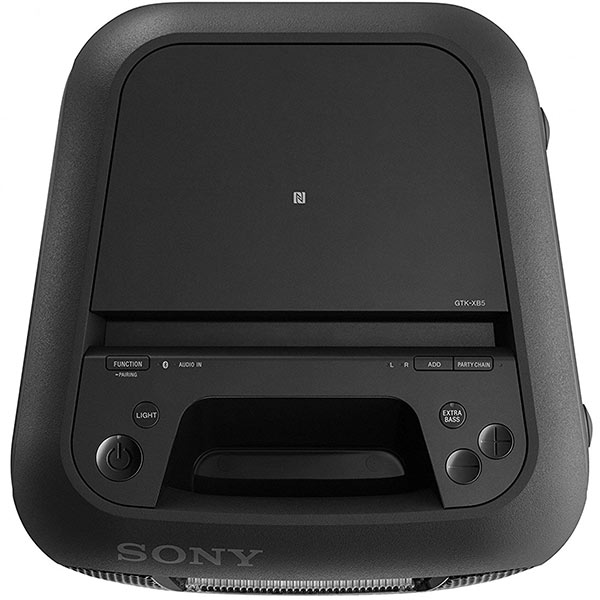 قسمت بالای پخش کننده GTK-XB5 محل مناسبی برای قرار گیری کنترل پنل دستگاه میباشد. بر روی کنترل پنل این پخش کننده کلیدهای POWER ، Light ، تنظیم سطح صدا، EXTRA BASS ، ADD ، نشانگرهای ال ای دی و … دیده میشود که کاربر از طریق آنها میتواند تنظیمات مختلف را به دستگاه اعمال کند. با کمک نشانگرهای ال ای دی به راحتی میتوان فهمید که صدای منتشر شده از کدام یک راههای ارتباطی سرچشمه میگیرد. در صورت استفاده از هر کدام، نشانگر مخصوص به آن روشن خواهد شد و کاربر به راحتی منبع تامین صدا را تشخیص میدهد. پایههای کوچکی که در قسمت سمت راست بدنه این سیستم صوتی قرار گرفتهاند مانع از لیز خوردن و افتادن دستگاه خواهند شد.