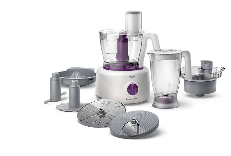 فیلیپس غذاساز 7757 را با طراحی ساده و در رنگ بدنهی سفید و بنفش تولید کرده تا هماهنگ با دکوراسیون منزل شما باشد. البته حضور این دو رنگ در کنار هم، جلوهای بسیار زیبا دارند. این دستگاه غذاساز از بدنهای پلاستیکی تولید شده که موجب سبک بودن آن شده است. همان طور که قبلاً اشاره شد، این غذاساز از اجزای متفاوتی تولید شده که هر کدام از آنها وظیفهی انجام کاری خاص را بر عهده دارند. ظرف غذاساز، پارچ مخلوط کن، صفحات رنده، تیغه، سریهای همزن و سری آبمرکبات گیر در کنار هم جمع شدهاند تا کارهای شما را در سریع ترین زمان ممکن با ارائهی نتیجهای مطلوب انجام دهند. تمامی این قطعات به سادگی بر روی دستگاه اصلی با امنیت بالا نصب میشوند. بر روی بدنهی اصلی دستگاه دکمهی چرخشی جهت تنظیم میزان سرعت مناسب قرار داده شده. ظرف غذاساز مندرج، از پلاستیک شفاف تولید شده تا بر روی روند انجام کار نظارت داشته باشید. این ظرف دارای حجم 3.4 لیتر میباشد که امکان تهیهی مواد غذایی زیادی را با یک بار استفاده فراهم میسازد. پارچ مخلوط کن نیز شفاف و مندرج است که دارای درپوشی پلاستیکی است؛ وجود این درپوش مانع از ریخت و پاش مواد هنگام انجام کار خواهد شد. پارچ مخلوط کن با ظرفیت 2.2 لیتری تولید شده تا اسموتی برای بیش از 5 نفر را در یک با استفاده، آماده کند.از لوازم جانبی همراه این غذاساز فیلیپس میتوان به حضور 2 صفحه رنده از جنس استیل ضد زنگ اشاره کرد که می توانید از آن ها جهت رنده کردن انواع مواد غذایی استفاده کنید.