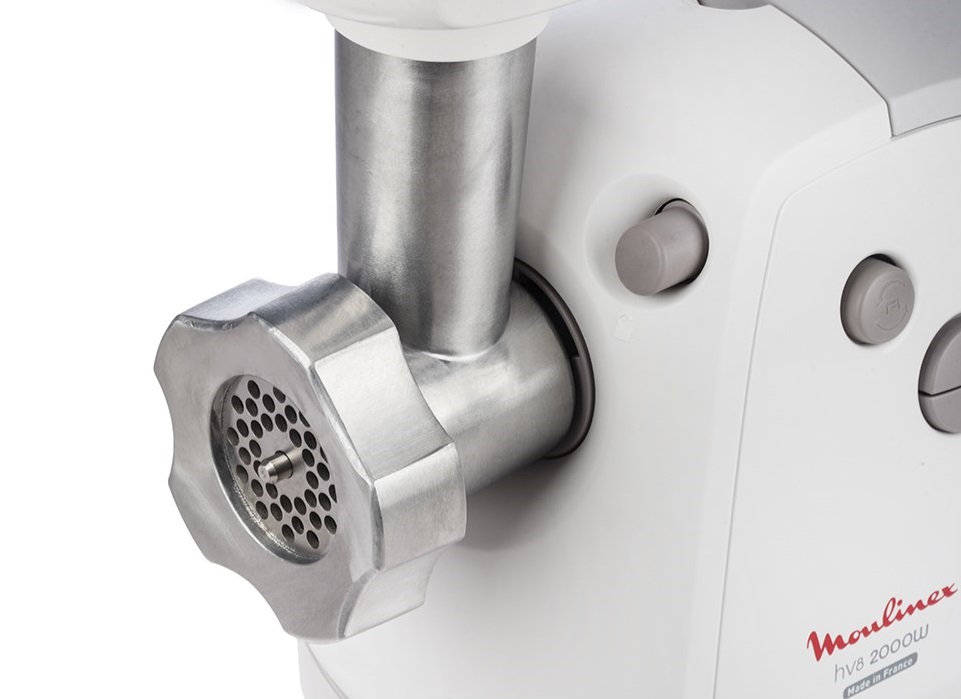 چرخگوشت Hv8 از شرکت مولینکس از آن دسته محصولاتی است که اگر لوگوی شرکت سازنده را هم از روی بدنه آن حذف کنیم، بازهم میتوانیم تعلق آن به این تولیدکنندهی فرانسوی را از روی ظاهر آن متوجه شویم. این چرخگوشت ظاهری فوقالعاده دوستداشتنی دارد و میتوان آن را جزو زیباترین تولیدات این شرکت قرارداد. این چرخگوشت توانی معادل با 2000 وات دارد. علاوه بر این طبق اعلام شرکت سازنده قادر است دو کیلو و نهصد گرم گوشت را در هر دقیقه چرخ کند. بدنه این دستگاه پلاستیکی است و روی بدنه آن علاوه بر دکمه روشن/ خاموش، دکمهای جهت چرخش معکوس تیغهها در نظر گرفتهشده است. اما یکی از نکات جالبتوجه در مورد این مدل، محفظه قرارگیری لوازم جانبی در آن است. تمامی لوازم جانبی و تیغهای این چرخگوشت در بدنه این مدل قرار میگیرند و احتمال گمشدن آنها در آشپزخانه به صفر میرسد.