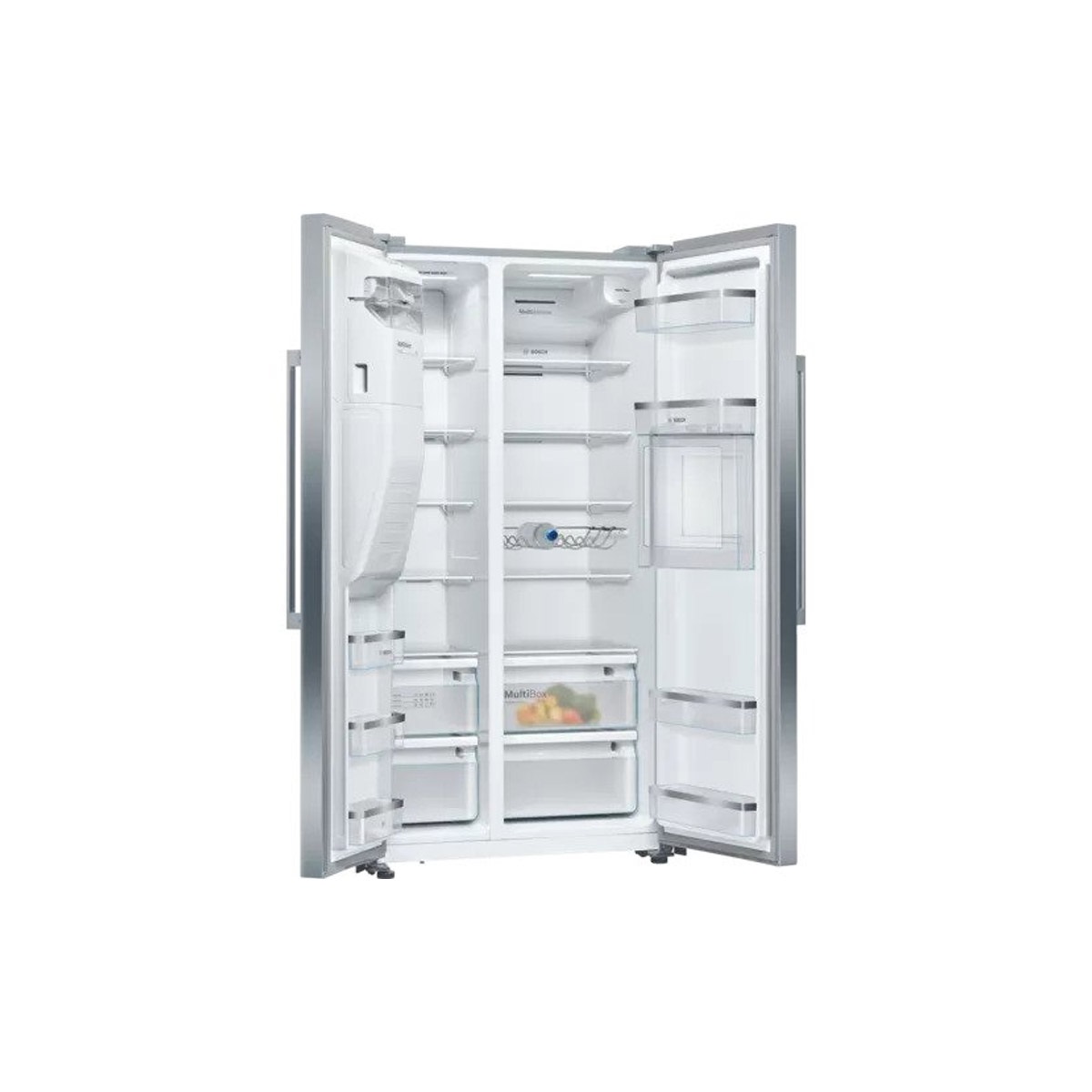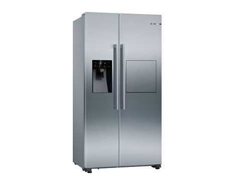 یخچال فریزر ساید بای ساید بوش مدل KAG93AI304 از محصولات بی نظیر این کمپانی با طراحی بسیار زیبا و جا دار می باشد. این یخچال فریزر به رنگ نقره ای را می توان با دکوراسیون اشپزخانه و وسایل موجود در ان به اسانی ست کرد. روی بدنه این محصول یک مینی بار و ابریزر طراحی شده است. دسته های تعبیه شده برای باز و بسته کردن درب ان عملکردی عالی دارند. روی بدنه این محصول جای اثر انگشت و لکه باقی نمی ماند. ظرفیت کلی این یخچال فریزر 30 فوت و یا 531 لیتر است که 366 لیتر ان به یخچال و 165 لیتر از ان به فریزر اختصاص داده شده است. برای قسمت داخلی یخچال از تعداد 5 طبقه در اندازه بزرگ برای ذخیره سازی مواد غذایی و خوراکی ها استفاده شده است روی طبقه دوم یک دنده مخصوص نگهدارنده بطری تعبیه شده است که می توان روی ان تعدادی بطری اب و یا نوشیندنی در اندازه مختلف را نگهداری کرد. دو کشو بزرگ برای ذخیره میوه و سبزیجات در این بخش تعبیه شده است. داخل این کشو ها میوه و سبزیجات به صورتی کاملا سالم و تازه برای مدت زمان طولانی باقی می مانند. روی درب بخش یخچال 4 طبقه برای نگهداری از شیشه ها و بطری ها طراحی شده است. روی این طبقات بطری ها در اندازه بزرگ و کوچک و شیشه مربا و … قابل نگهداری است. برای قسمت فریزر نیز 5 طبقه مختلف استفاده شده است این طبقه ها نسبت به یخچال اندازه کوچک تری دارند اما می توان روی ان ها به اسانی مواد غذایی فریز شده زیادی را ذخیره سازی کرد. دو کشو و سه طبقه مختلف داخل این بخش را نیز می توان برای نگهداری مواد غذایی مختلف مانند گوشت، مرغ و … استفاده کرد.