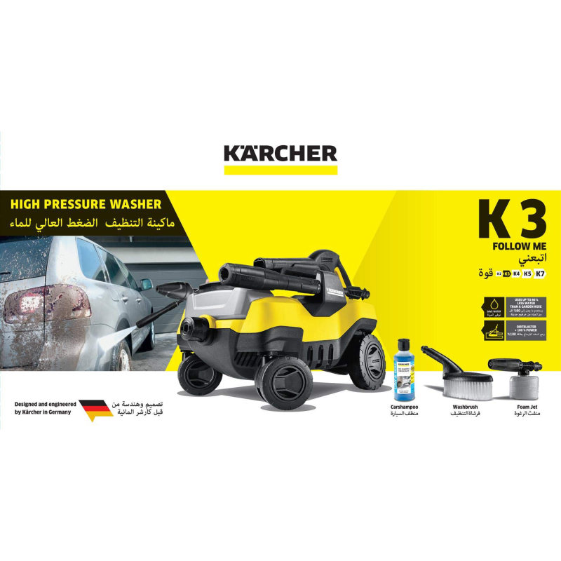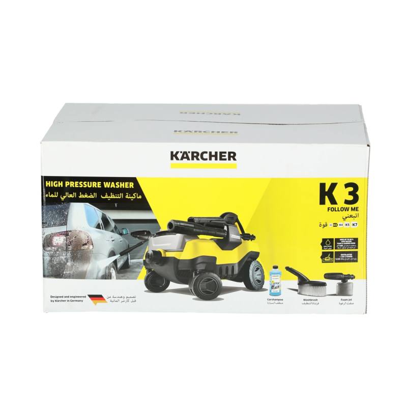 کارواش کارچر (کرشر) مدل K3 FOLLOW ME دستگاهی برای شست و شوی انواع سطوح مختلف است.از این کارواش (Water Jet) می توان در خانه برای شست و شوی اتومبیل و موتور سیکلت ، دوچرخه ، ابزارهای باغبانی ، شست و شوی حیاط و … استفاده کرد.کارواش فالو می (K3 FOLLOW ME) محصول شرکت کارچر (KARCHER) المان است و توانسته مشتریان زیادی را در بازارهای سراسر دنیا به خود جذب کند.کارواش کارچر مدل K3 FOLLOW ME دارای 4 عدد چرخ می باشد که جا به جایی و حمل کارواش خانگی را بسیار راحت تر کرده است. دستگاه را به هر طرف که بخواهید می توانید به دنبال خودتان بکشید و نیازی به جابجایی با دست نمی باشد. احتمال افتادن دستگاه به صفر رسیده است.