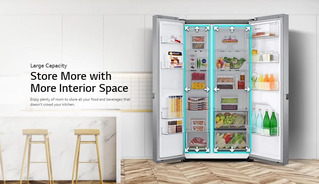 در فضای داخلی یخچال ساید بای ساید 30 فوتی یک مجموعه از کشوها و قفسه ها تعبیه شده اند که قرار است کمک کنند تا شما مواد غذایی بیشتری را در آن جای دهید. قسمت راست دستگاه را به عنوان یخچال که 424 لیتر است، در نظر گرفته اند و قسمت چپ فریزر با ظرفیت 270 لیتر به چشم می خورد. در این مدل بر عکس سایر مدل های یخچال 287، چیزی به نام آبسرد کن تعریف نشده است، اما طراحان قسمت یخساز را فراموش نکرده و به فکر تابستان شما بوده اند. در قسمت فضای داخلی درب فریزر ، یک قفسه برای ساخت یخ با سایز متوسط تعبیه شده که به صورت دستی کار می کند.