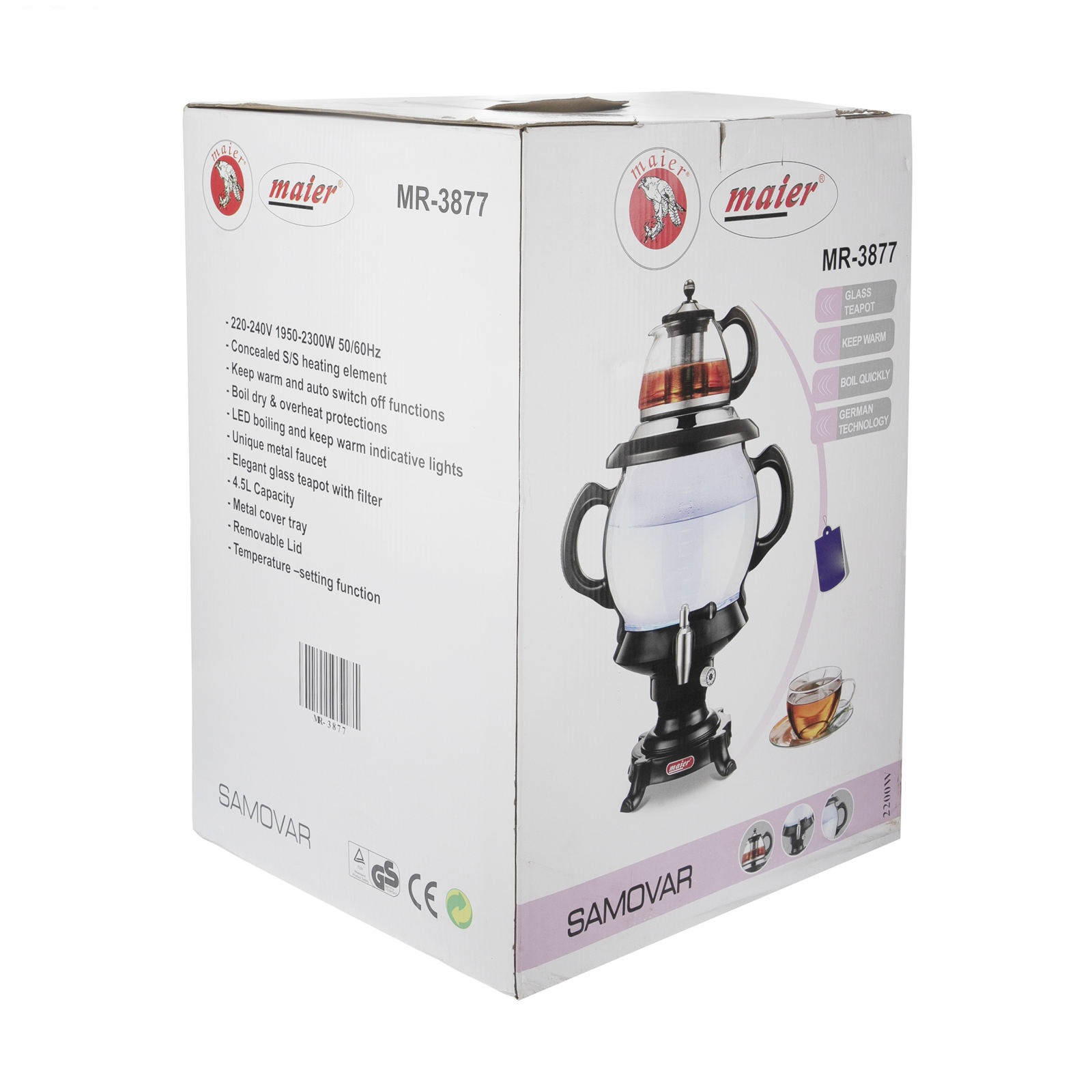 سماور برقی یکی دیگر از لوازم خانگی است که در اکثر منازل، ادارات و سازمان ها و رستوران ها مورد استفاده قرار می گیرد و با استفاده از انرژی الکتریکی، آب را جهت تهیه چای، به دمای مناسب می رساند.سماور برقی مدل MR-3877 با توان 2300 وات دستگاهی با طراحی کارآمد و عملکرد مدرن است که به راحتی و در کوتاهترین زمان ممکن آب جوش و چای خوش عطر و طعم داری را آماده می کند.جنس بدنه این مدل سماور برقی از پیرکس ساخته شده است. ظرفیت ان 4.5 لیتر است که در مقایسه با مدلهای مشابه خیلی بیشتر است. قوری که به روی سماور قرار می گیرد نیز از جنس پیرکس می باشد. ظرفیت قوری 1 لیتر است. این کالا با برخورداری از گنجایش بالای قوری و سماور قابل استفاده در مهمانی های خانوادگی می باشد.