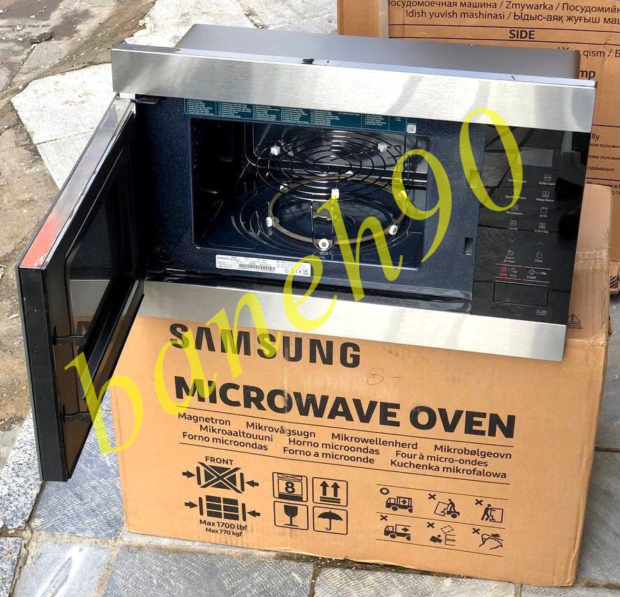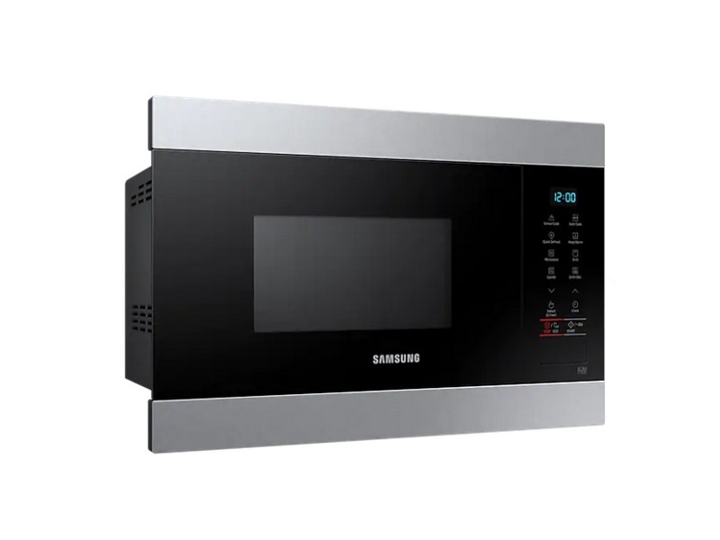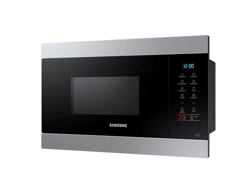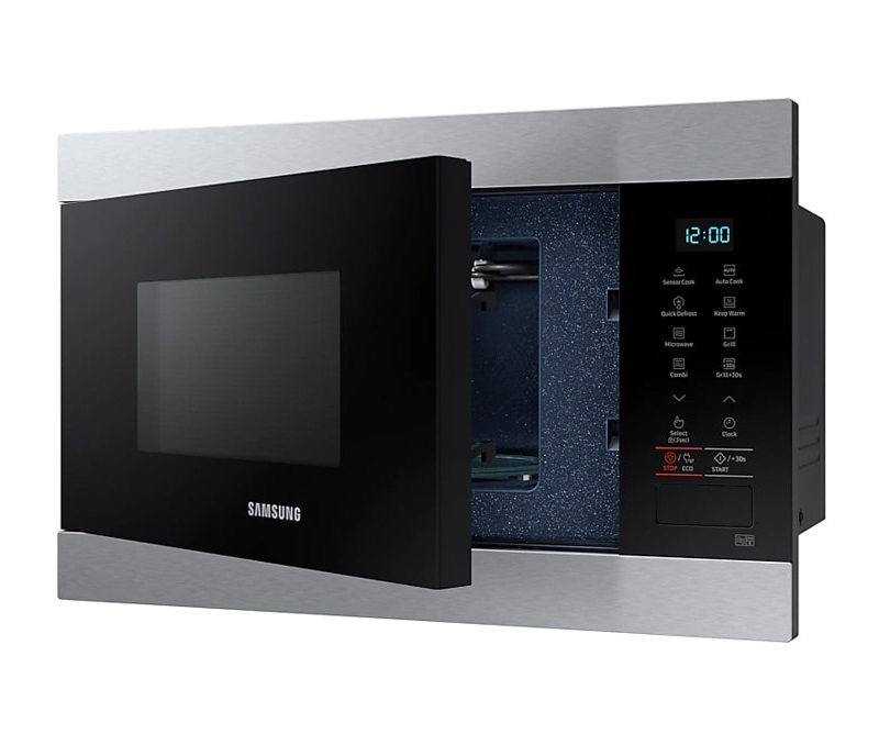 همه ی ما شاید دیده باشیم که در آشپزخانه های معمولی و سنتی فر ها به همراه اجاق گاز در منزل بودن و به عنوان تند پز از آن استفاده می کردند. اما امروزه به دلیل ورود مایکروفر های نویناین مشکل برای خانواده ها حل شده است و شما با داشتن فضای متناسب می توانید دستگاه تند پز جمع و جور را به خانه های خود هدیه بدهید. این محصول سامسونگ طراحی هوشمندانه دارد و با داشتن ابعاد 595، 380 و 320 میلی متر ظاهری جمع وجور را در فضای بین کابینت ها یا داخل دیوار را به خود اختصاص می دهد و دکوراسیون زیبایی به آشپزخانه هایتان می دهد. در نمای جلو اگر به این محصول بنگرید کاملا صاف و یکدست دیده می شود و هیچ برآمدگی اضافی ایجاد نمی کند. بدنه ی این دستگاه زیبا از جنس فلز است که بسیار مقاومت بالایی دارد و در برابر ضربات و خط و خش کیفیت اصلی خود را حفظ می کند. حاشیه ی بالا و پایین این دستگاه رنگ نقره ای دارد و هم چنین نمایشگر و درب آن نیز با رنگ مشکی مزین شده است که ترکیب این دو رنگ زیبایی عظیمی در جلوه ی ظاهری این محصول پدید آورده است و با هر دکوراسیون سریعا سازگار می شود. سمت راست این مایکروفر مجهز به کلیدی است که با فشار آن امکان باز و بسته شدن درب آن برای کاربر بسیار آسان می شود هم چنین پنل نمایشی آن نیز در این قسمت قرار دارد که با داشتن کلیدهای لمسی امکان تغییر و اعمال تنظیمات جدید این دستگاه را متناسب با هر مواد غذایی به مصرف کننده می دهد. طراحی داخلی مایکروفر سامسونگ و فضای درون آن نیز کاملا استاندارد می باشد؛ به طوری که با باز کردن درب آن با محیطی آراسته و مرتب روبه رو می شوید. محفظه ی داخل دستگاه نیز از یک سرامیک مقاوم ساخته شده که بعد از پخت غذا چربی ها را به خود جذب نمی کند و به راحتی لکه های چربی از روی آن پاک می شود و نیاز به شستشو ندارد بنابراین فضای داخلی همیشه تمیز و به دور از انباشتگی چربی ها می باشد. این محفظه بسیار مقاوم بوده و در برابر ضربات و زنگ زدگی کیفیت اولیه ی خود را حفظ می کند. هم چنین شیشه ای گردان 255 میلی متری در فضای داخل موجود است که کاملا قابلیت چرخشی دارد تا تمام سطح و قسمت های داخلی غذا به طور یکدست پخته و آماده شود. ظرفیت داخلی این محصول 22 لیتر است که با یک بار چرخه ی پخت مواد غذایی حجیمی را دربر می گیرد و زمان را برای شما خریداری می کند.