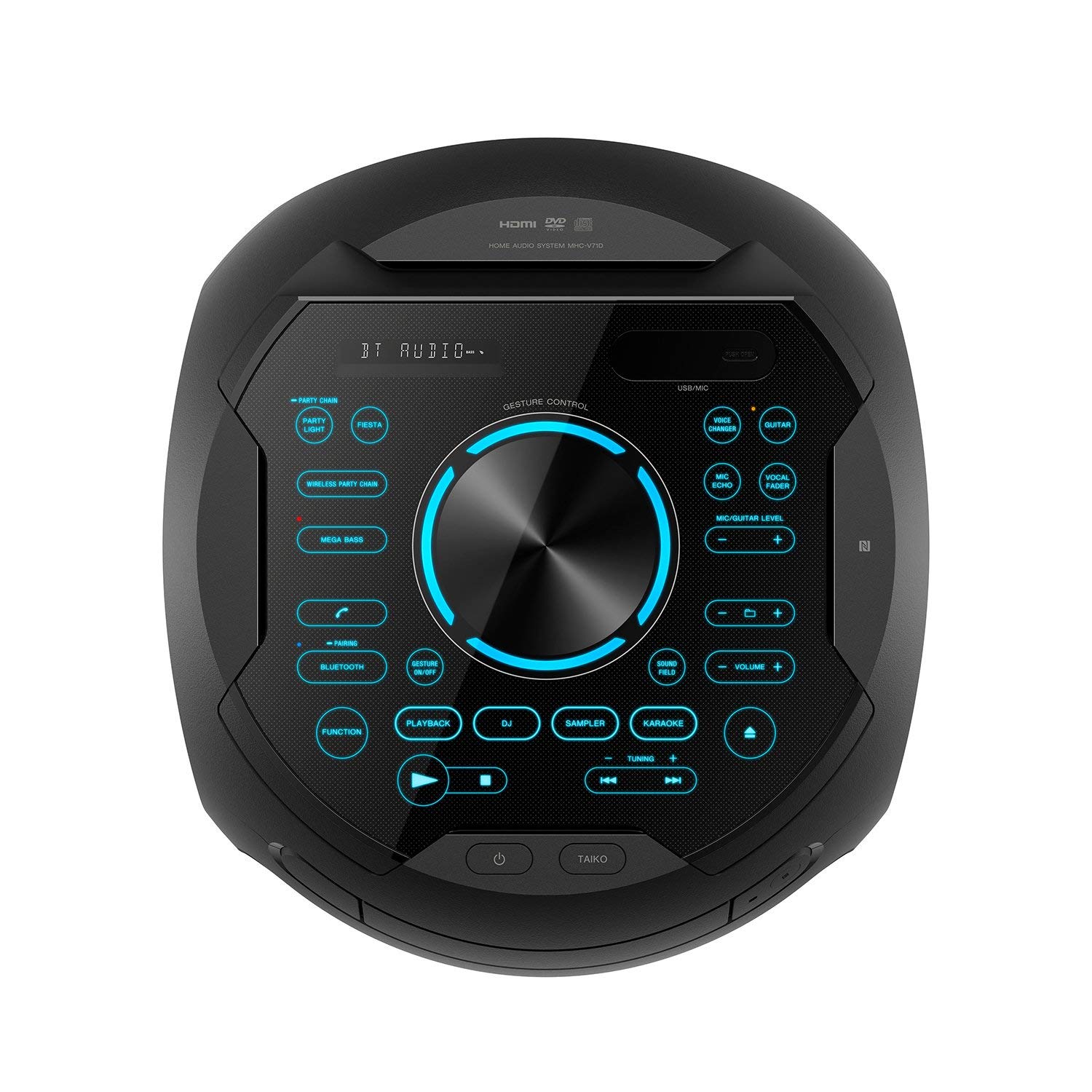 شرکت سونی به تازگی سیستم صوتی سونی V71 را معرفی کرده است. اندازه جمع و جور این سیستم صوتی به همراه طراحی فوق العاده می تواند بهترین گزینه برای انواع مهمانی های دورهمی و حتی محیط های باز باشد. از طرفی قدرت فوق العاده بالای این سیستم صوتی حس جدید و متفاوت شنیداری را در کاربر زنده می کند. از مهمترین ویژگی های برجسته این سیستم صوتی می توان به حالت DJ و هر کدام از چهار حالت PAN، Isolator، WAH و همچنین Flanger اشاره کرد، که در بخش های بعدی به توضیح هر کدام خواهیم پرداخت. همانطورکه از طراحی این سیستم صوتی پیداست، به محض روشن شدن آن رنگ های فوق العاده زیبایی از آن ساتع می شوند، که قادرند تا 360 درجه از فضای محیط را رنگی کنند. فناوری کارائوکه یکی از مزیت های برجسته این سیستم صوتی می باشد، که با آن تجربه حس خواننده واقعی در کاربر احیا می شود. پنل سیستم صوتی سونی مجهز به حالت TAIKO می باشد، که با ضربه زدن به آن و ایجاد حالت تبل، یک درام ژاپنی را می توان در محیط احساس کرد. به علاوه بهره گیری از کابل گیتار به کاربر اجازه می دهد، تا با زدن دکمه گیتار از شنیدن آهنگ های موردعلاقه تان بر روی این سیستم صوتی لذت ببرید. سونی با جای دادن قابلیت ژنراتور صدا به افزایش وضوح صوت این سیستم کمک بزرگی کرده است. همچنین قابلیت گسترش دادن سیستم صوتی و پشتیبانی آن تا 50 باند اسپیکر دیگر به وسیله بلوتوث میسر می باشد، که با ارائه صدای فوق العاده قدرتمندش محیط را سرشار از صدا می کند. همچنین از طریق برنامه Fiestable که یک برنامه رایگان برای سیستم عامل های اندروید و iOS است؛ به کاربر امکان کنترل رنگ های نور را می دهد. حالت فوتبال یکی از حالت های سیستم صوتی سونی می باشد، که با صدای فوق العاده قوی آن؛ کاربر را به فضای استادیوم دعوت می کند. از دیگر ویژگی های سیستم صوتی سونی می توان به خروجی HDMI، ضد آب بودن پنل آن، برنامه DSEE و همچنین برنامه NFC اشاره کرد.