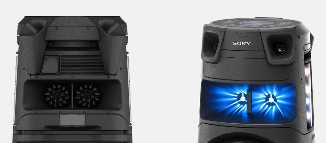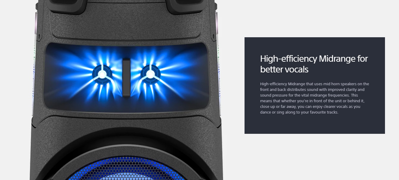 این سیستم دارای دو بلندگو در قسمت نیم تنه خود می باشد که به کمک آنها صدا تقویت یافته و با فشار بیشتری به اطراف پخش می شود. به گونه ای که در هر قسمت از مجلس و محیط میهمانی، صدای پر واضحی قابل شنیدن خواهد بود. سونی از این بلندگوها با عنوان High-Efficiency Midrange یاد می کند زیرا با قدرت بالایی که دارند موجب افزایش توان صدا حتی در دورترین نقاط محیط می شوند.