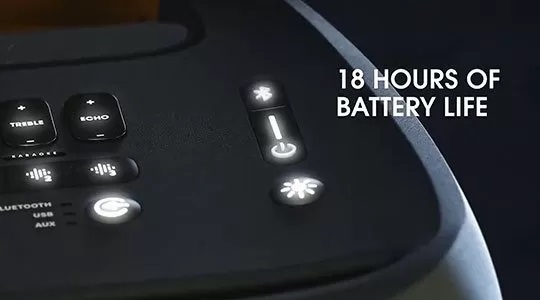 هنگامی که در محیطی مانند خانه از این اسپیکر استفاده می کنید ، به دلیل وجود پریز برق میتوانید از طریق آداپتور برق انرژی اسپیکر خود را تامین کنید. اما اگر در محیطی بیرون از منزل و یا در سفر باشید ، جای نگرانی نیست. این اسپیکر دارای باتری قابل شارژ با ظرفیت بالایی می باشد که با هر بار شارژ کامل قادر است تا 18 ساعت بصورت مداوم در خدمت شما باشد. این مدت زمان بستگی به شرایط مختلفی مانند ولوم صدا ، روشن یا خاموش بودن رقص نور و طول عمر باتری دارد و ممکن است متفاوت باشد.