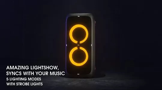 یکی از ویژگی های اصلی این اسپیکر که بر زیبایی آن افزوده است ، رقص نور خیره کننده آن می باشد که دور ووفر اسپیکر قرار گرفته است ، رقص نور زیبا و جذاب یکی از لازمه های اصلی مهمانی های پر هیجان می باشد که جی بی ال آن را در این اسپیکر گنجانده است. هنگام پخش موسیقی نورپردازی هماهنگ با ریتم موزیک را تماشا کنید و از حس زیبایی که این اسپیکر برای شما به وجود آورده است لذت ببرید. با استفاده از پنل مدیریت اسپیکر میتوانید به حالت های مختلف پیش فرض نمایش نور دسترسی داشته باشید و از بین آن ها نورپردازی دلخواه خود را انتخاب کنید.