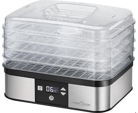 میوه خشک کن پروفی کوک مدل PC-DR 1116 ، وسیله ای کاربردی و کارامد از برند آلمانی است که امروزه توجه بسیاری را به سوی خود جلب نموده و برای دوستداران به تنقلات و میوه های خشک بسیار ایده آل می باشد. با استفاده از این دستگاه به راحتی می توان میوه، سبزیجات و حتی گوشت را خشک کرد و از تهیه سالم و طبیعی آنها نهایت لذت را برد. در قسمت جلویی این دستگاه یک عدد صفحه نمایش LCD قرار گرفته است که قادر است دمای دستگاه را به شما نمایش دهد. علاوه بر تنظیمات مربوط به نحوه نمایش دما، می توانید دمای دستگاه را نیز تحت کنترل خود قرار دهید. دمای این دستگاه در 7 سطح مختلف و در بازه 40 تا 70 درجه سانتی گراد قابل تنظیم می باشد. این میوه خشک کن دارای سیستم ایمنی محافظ در برابر درجه حرارت های بالا می باشد. وجود یک فن تهویه در ساختار این میوه خشک کن و عملیات تهویه هوا باعث می گردد که هرگز درجه حرارت این دستگاه از حد مجاز بالاتر نرود.