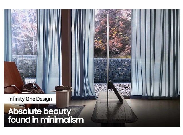 این مدل از طراحی نفس گیری برخوردار بوده که در همان نگاه اول بینندگان را شیفته و مجذوب زیبایی خود کرده و با توجه به طراحی ساده ی خود با هر محیط و دیزاینی ادغام پیدا میکند و نمایی لوکس و لاکچری را به محیط القا می بخشد. سازندگان سامسونگ به قدری با دقت و حوصله بدنه ی این نمایشگر را با رنگ مشکی و فریم های نقره ای آرایش نمودند که نمایی بسیار مدرن را به خانه های شما تقدیم می نماید. قاب بسیار باریک و ظریف که از برجسته ترین مشخصههای این تلویزیون به شمار میرود، با داشتن قطر 15 میلی متری که دارد بیننده احساس می کند که انگار اصلا قابی در کار نیست.