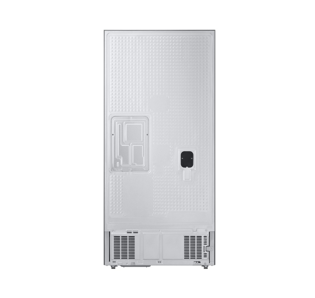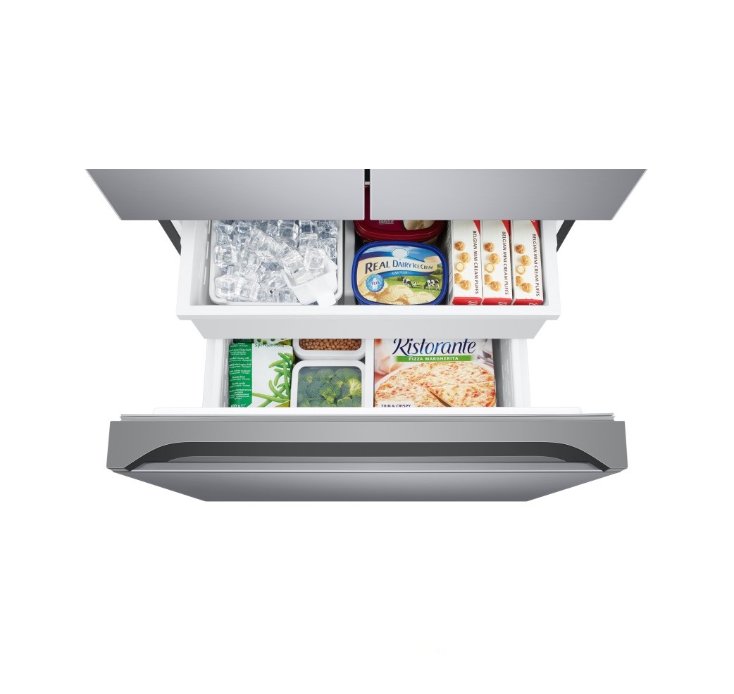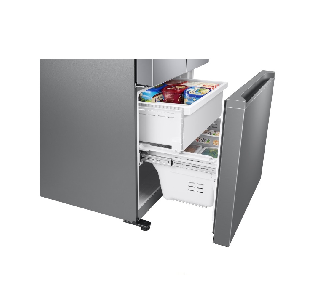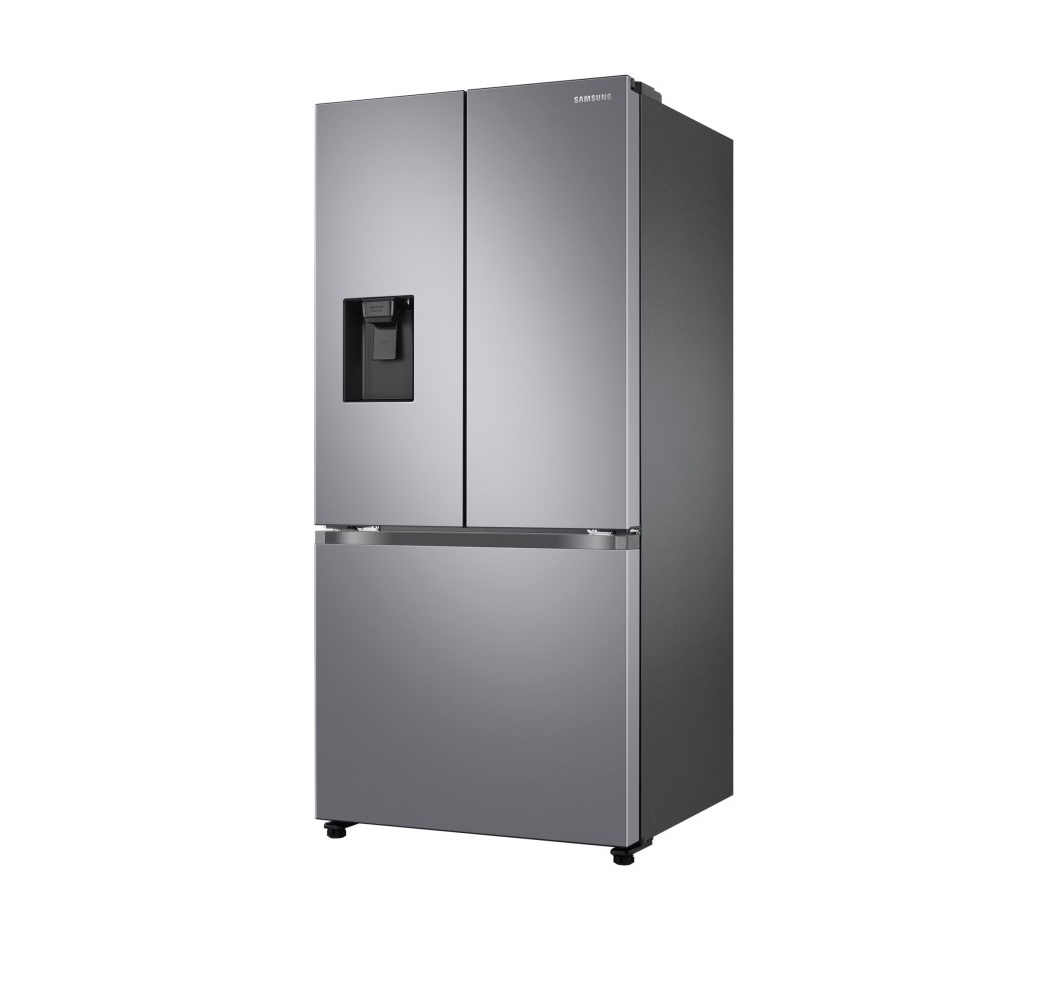 یخچال و فریزر فرنچ سامسونگ فاقد دستگیرههای میلهای میباشد و این موضوع بر زیبایی محصول افزوده است. در قسمت بالای یخچال، دو درب مشاهده میشود. بر روی درب سمت چپ، مخزن آبریز تعبیه شده است. این مخزن به کاربران این امکان را میدهد که بدون باز و بسته کردن مداوم درب، به آب و یخ دسترسی داشته باشند و از هدر رفت هوای داخل یخچال جلوگیری به عمل آید. قسمت پایین یخچال برای فریزر تعبیه شده است. این درب به صورت کشویی است و همانند کشو بیرون آورده میشود. این طراحی، در عین زیبایی خاصی که به یخچال بخشیده است سبب راحتی جایگذاری مواد غذایی در یخچال میشود.