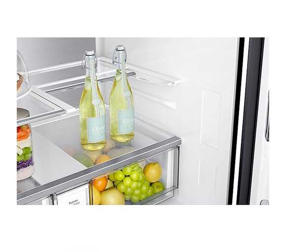 RF71DG9H0EB در قسمت یخچال دارای یک قفسه کشویی انعطاف پذیر است که به شما کمک می کند اقلام بزرگ و حجیم مانند بطری های بلند و یا کیک های چند طبقه را به راحتی در یخچال جای دهید و از فضای یخچال به بهترین نحوه استفاده کنید. در صورت نیاز می توانید نیمه از قفسه را به داخل هل دهید تا ارتفاع بین قفسه ها بیشتر شود. هنگامی که قفسه به داخل فشار داده می شود، بطری ها یا ظروف بلندی تا 440 میلی متر (173.2 اینچ) ارتفاع و 360 میلی متر (141.7 اینچ) عرض در یخچال جای خواهند گرفت.