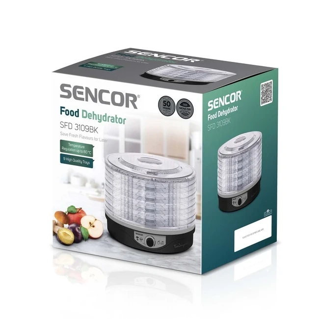 میوه خشک کن سنکور مدل SFD 3109BK محصول برند معتبر sencor می باشد. شما با میوه خشک کن سنکور مدل 3109 می توانید انواع میوه ها از جمله گلابی، زردآلو، پرتقال، موز و سیب را خشک کرده و برای مدت طولانی نگهداری کنید و به عنوان میان وعده های سالم و پر انرژی از آن ها استفاده کنید.