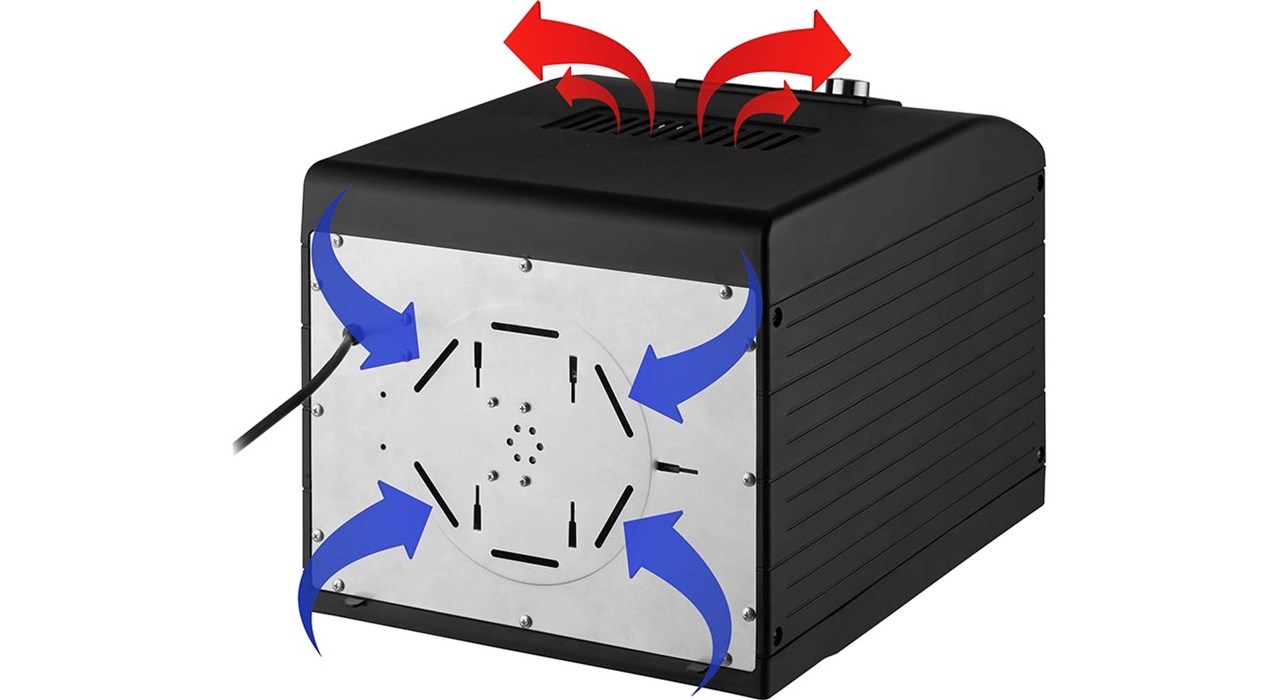 در میوه خشک کن سنکور SFD 6600BK یک تکنولوژی ابداعی به کار گرفته شده است. یک فن در پشت دستگاه قرار گرفته شده است و جریان هوای خشک و داغ را به سمت جلو هدایت می کند. توزیع دمایی به صورت یکنواخت انجام گرفته و به صورت برابر، هوای خشک بر روی تمام سینی ها دمیده می شود.