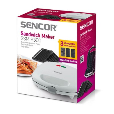 ساندویچ ساز سنکور مدل ssm 9300 با طراحی زیبا و مدرنی که دارد جای کمی را در آشپزخانه اشغال می کند که مخصوص خانواده های کم جمعیت می باشد. توان مصرفی این محصول 700 وات می باشد . کف آن به علت این که نمی چسپد و جدا می شود بسیار راحت شسته می شود. دستگاهی ۳ کاره است که از ان برای تهیه و برشته کردن نان تست ها، گریل کردن و کباب انواع گوشت و سبزیجات و تهیه ی وافل مورد استفاده قرار می گیرد بدنه ساندویچ ساز SSM 9300 و همچنین دسته آن کاملا خنک بوده و می توان براحتی هنگام روشن بودن، آن را جا به جا نمود. همچنین دو چراغ راهنما، اولی به رنگ قرمز برای نشان دادن و ضعیت روشن بودن و دومی به رنگ سبز، برای نشان دادن و ضعیت آماده به کار بودن، روی بدنه این ساندویچ ساز سنکور تعبیه شده است.