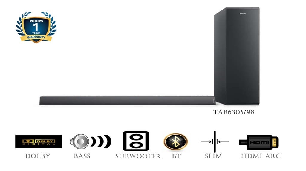 ساندبار فیلیپس مدل TAB6305 از سیستم های صوتی این شرکت است که هم دارای طراحی بسیار زیبا و باریک است و هم دارای توان و کیفیت صوتی بسیار خویی است. این ساندبار 2.1 کاناله است و دارای دو اسپیکر و یک ساب ووفر است که در مجموع از توان صوتی 140 وات برخوردار است. هم نوار صوتی و هم ساب ووفر باریک طراحی شده اند تا به راحتی در مکان مورد نظر شما نسبت به تلویزیون قرار بگیرند. این ساندبار از فرمت Dolby Audio پشتیبانی می کند و قابلیت پخش صدای با کیفیت مناسب را دارد. برای آن درگاه های ارتباطی مختلفی در نظر گرفته شده است تا به راحتی دیگر پخش کننده های صوتی و تصویری نیز قابلیت پخش داشته باشد. فیلیپس از تولید کنندگان بنام در زمینه محصولات صوتی و تصویری در دنیا است.