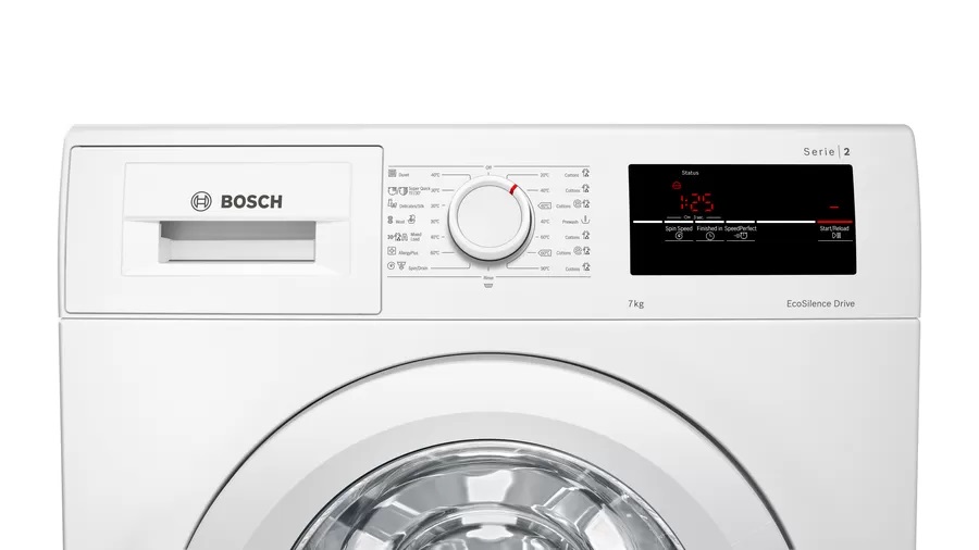 ماشین لباسشویی بوش WAJ20170ME با ظرفیت 7 کیلوگرم مناسب خانواده های پر جمعیت می باشد که در هر بار شستشو حجم زیادی از لباس را در خود جای می دهد. صدای کم موتور این دستگاه کمترین مزاحمت را برای شما ایجاد نخواهد کرد. این لباسشویی دارای رده انرژی +++A بوده که جزء کم مصرف ترین لباسشویی های بازار می باشد و موجب 30% مصرف انرژی کمتری می شود. سیستم لکه بری این لباسشویی کمک میکند تا این دستگاه قادر باشد انواع لکههایی که پاک کردن بسیار سختی دارند (شامل لکههای شکلات، چای و …) به خوبی از بین ببرد. این ماشین لباسشویی به صورت اتوماتیک دمای آب، نوع حرکت دیگ داخلی و زمان خیس خوردن لباس را بر اساس لکههای روی لباس و قبل از شروع برنامه انتخابی شستشو تعیین میکند.