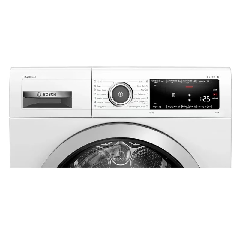 خشک کن 9 کیلو بوش دارای مدل های مختلفی است و همانند سایر دستگاه ها همانند لباسشویی ها مجهز به برنامه ها و دکمه های متعددی می باشد که با استفاده از آن های می توانید عملکرد خاصی را فعال کنید. خشک کن بوش مدل WTX87M90ME یکی از دستگاه های سری 8 و ساخت آلمان می باشد که دارای ظرفیت 9 کیلوگرم و بدنه ای به رنگ سفید است.