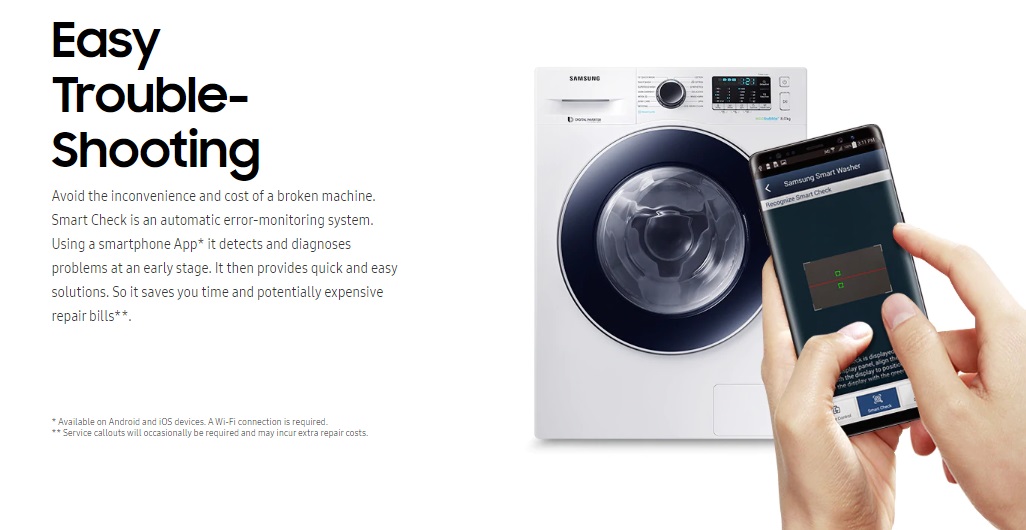 لباسشویی ساسونگ WW80J54E0BX قابلیت اسمارت را دارد به این معنی که شما می توانید آن را به گوشی خود وصل کرده و جستجوی مشکل پیش آمده برای آن بپردازید و بدون نیاز به تکنسین و صرف هزینه و زمان آن را برطرف کنید. Smart Check یک سیستم کنترل خطای خودکار است. این سیستم مشکلات را در مرحله اول تشخیص می دهد و راه حل های عیب یابی سریع و آسان را با استفاده از یک برنامه که روی گوشی های هوشمند نصب می شود، فراهم می کند.